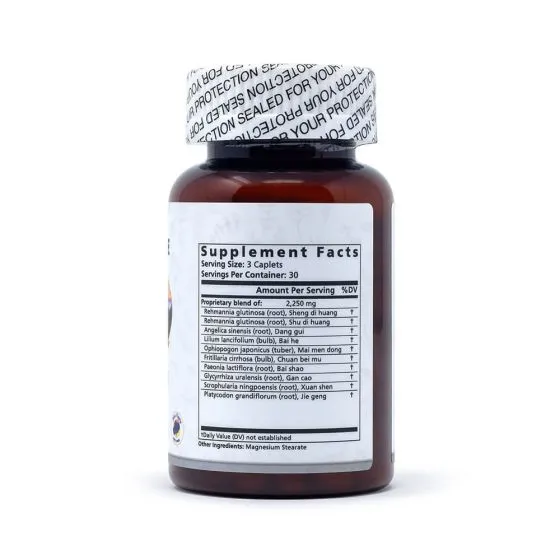 Sheng Di Huang (uncooked Radix Rehmanniae), Shu Di Huang (cooked Radix Rehmanniae), Dang Gui (Radix Angelicae Sinensis), Bai He (Bulbus Lilii) Mai Men Dong (Tuber Ophiopogonis), Chuan Bei Mu (Bulbus Fritillariae Cirrhosae), Bai Shao (Radix Alba Paeoniae), Gan Cao (Radix Glycyrrhizae) , Xuan Shen (Radix Scrophulariae), Jie Geng (Radix Platycodi)