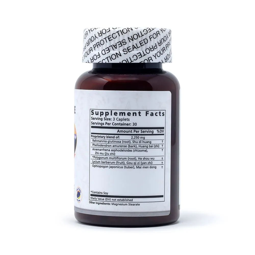 Shu Di Huang (cooked Radix Rehmanniae), Gui Ban (Plastrum Testudinis), Dry stir-fried Huang Bai (Cortex Phellodendri), Wine stir-fried Zhi Mu (Rhizoma Anemarrhenae)