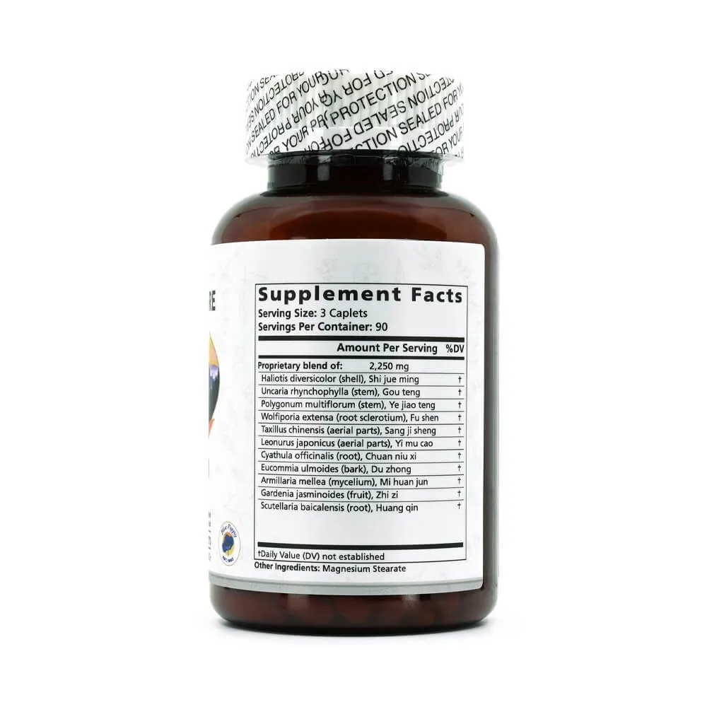 Shi Jue Ming (Concha Haliotidis), Gou Teng (Ramulus Uncariae Cum Uncis), Ye Jiao Teng (Caulis Polygoni Multiflori), Fu Shen (Sclerotium Paradicis Poriae), Sang Ji Sheng (Herba Taxilli), Yi Mu Cao (Herba Leonuri), Chuan Niu Xi (Radix Cyathulae), Du Zhong (Cortex Eucommiae), Mi Huan Jun (Armillaria Mellea), Zhi Zi (Fructus Gardeniae), Huang Qin (Radix Scutellariae)