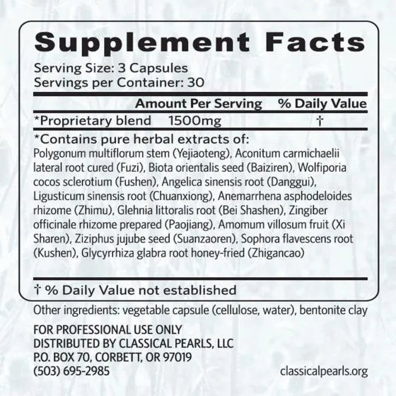 The design of Classical Pearls Peace Pearls offers a distinctive solution to common issues like anxiety and disrupted sleep. It merges the traditional yin tonic approach to insomnia, exemplified by Zhang Zhongjing’s 2nd-century remedy, Suanzaoren Tang (Sour Jujube Decoction), with the yang tonic Qianyang Dan (Submerge the Yang Pellet). The latter is a 19th-century adaptation of the classical Fuzi Lizhong Tang (Rectify the Middle Decoction with Aconite) by the esteemed scholar-physician Zheng Qin’an, the revered founder of the Fire Spirit School. Zheng Qin’an and his disciples view disordered sleep and other symptoms of upward energy as signs of a compromised Kidney battery, necessitating a retraction of life force into the lower dantian. This grounding effect is achieved through the combination of aconite and amomum.