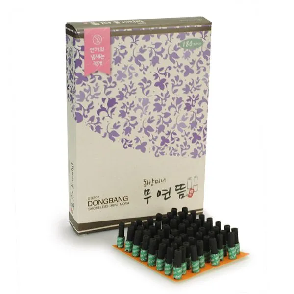 On easy to use sheets. Smokeless and odorless stick-on Sook moxa. The 1" x 0.3" dia Mini Moxa has a hole in the base for the moxa heat and a small hole on the side for air passage. The Mini Moxa (with green colored base) offers mild to hot heat. Box of 180.