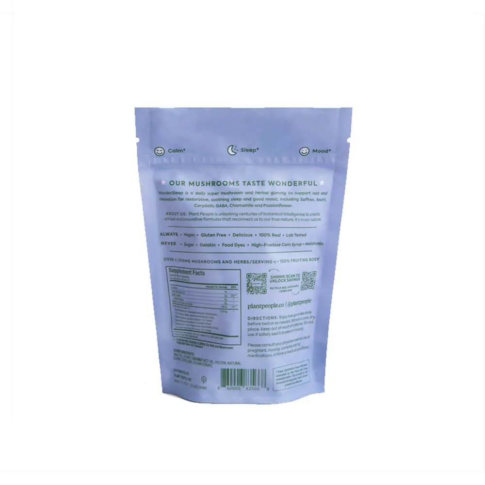Have a better day tomorrow through better sleep tonight with Plant People WonderSleep Mushroom Gummies. These gummies are formulated to support rest and relaxation for a deep, restorative night's sleep. They contain an effective blend of herbs and mushrooms, are melatonin-free, and feature a tasty wild elderberry flavor. They are lab-tested, vegan, non-GMO, gluten-free, and contain no sugar, corn syrup, dyes, or gelatin. Available in pouches of 60 gummies.