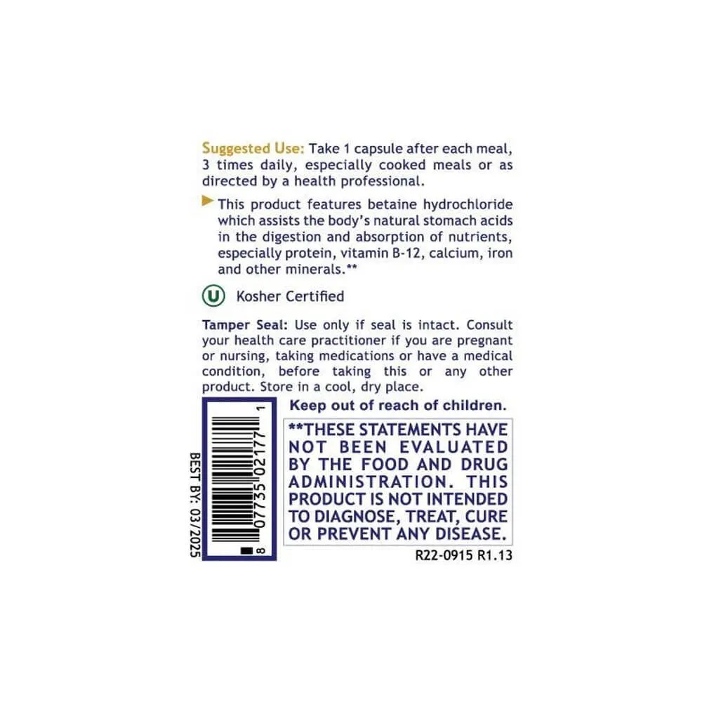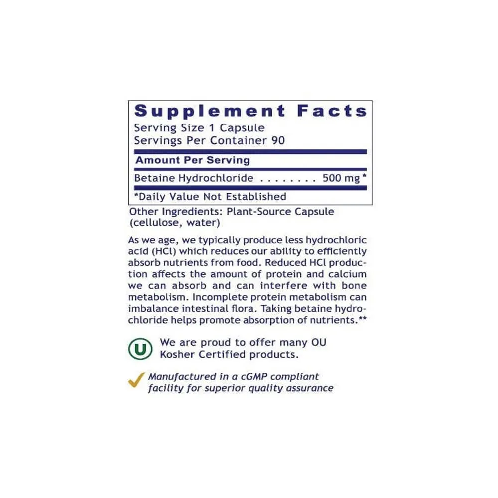 Premier Research Labs HCL provides support for optimal digestion and nutrient absorption in a high-quality supplement. Featuring the natural compound betaine hydrochloride, this formula may improve the digestion of proteins and other nutrients by increasing the acidity of the stomach and is enhanced by a proprietary enzyme blend that offers further support for healthy digestion and nutrient absorption. It is non-GMO, kosher-certified, and contains no added stearates, excipients, or preservatives. Premier Research Labs manufactures its products in an FDA-monitored, cGMP facility and sources raw materials from trusted suppliers all over the world using their strict purity protocols to consistently ensure the highest quality.