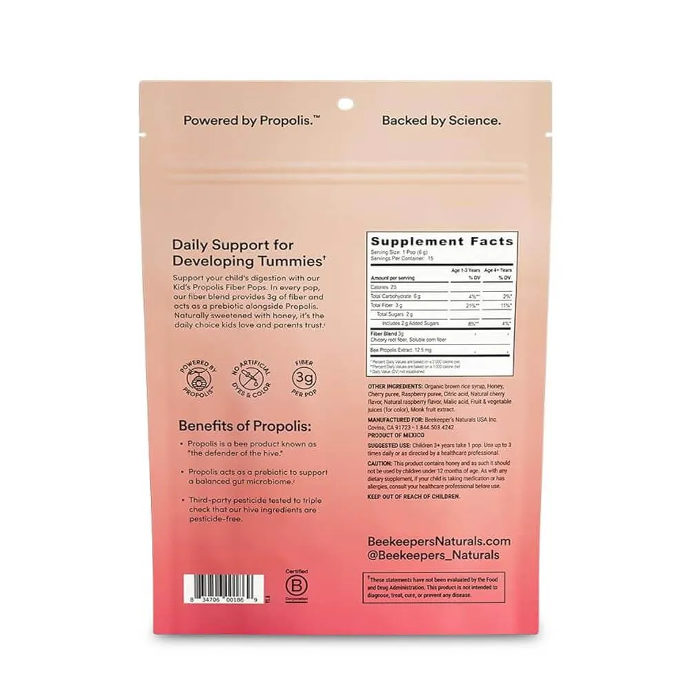 Beekeeper's Naturals Kid’s Prebiotic Fiber Pops provide tasty support for your child's digestion. Perfect for kids, these lollipops are formulated with a fiber blend, propolis, honey, and other natural ingredients, delivering 3g of fiber each to help your little one meet their daily fiber needs, regulate bowel movements, alleviate constipation, and support immune function. They feature a delicious cherry and raspberry flavor, are naturally sweetened with 2g of sugar per pop, and contain no processed sugars. They are non-GMO, are free from gluten, nuts, and dairy, and contain no food dyes or artificial flavors. Beekeeper's Naturals uses bee products sustainably-sourced and of the highest quality from remote apiaries and are third party-tested for pesticides and heavy metals to ensure only the best ingredients are packaged.