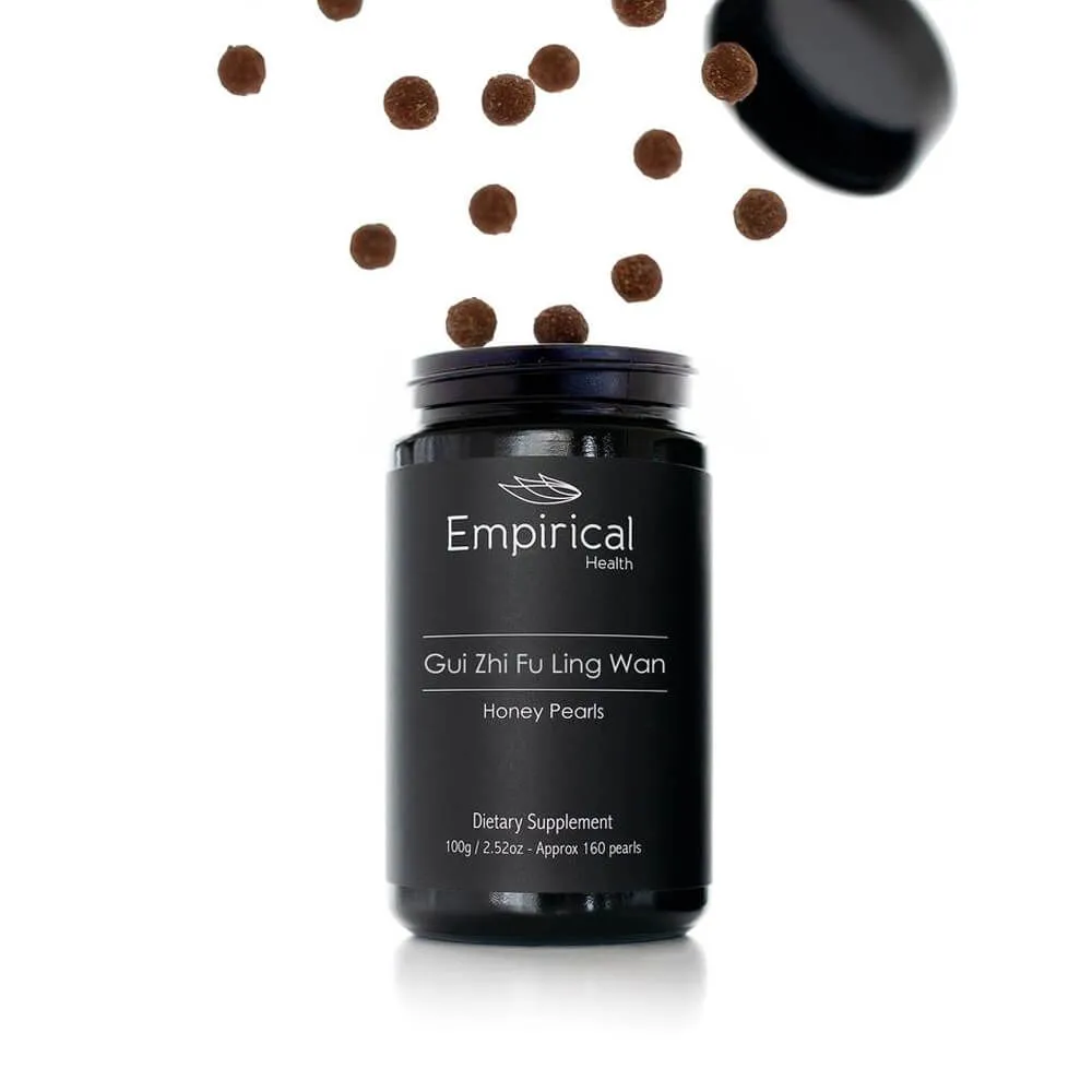 Empirical Health Gui Zhi Fu Ling Wan Honey Pearls provide maximum digestive absorption and a slow and steady release for peak potency of this classical Chinese medicine formula. Honey pearls are based on traditional honey pills, are vegetarian, paleo-friendly, and contain no artificial colors, flavors, preservatives, yeast, eggs, wheat, gluten, nuts, dairy, or animal products. Empirical Health uses certified-organic ingredients and tests every lot of each product in independent labs for heavy metals and microbiological components to ensure purity. Gui Zhi Fu Ling Wan Honey Pearls are available in 150 count bottles.