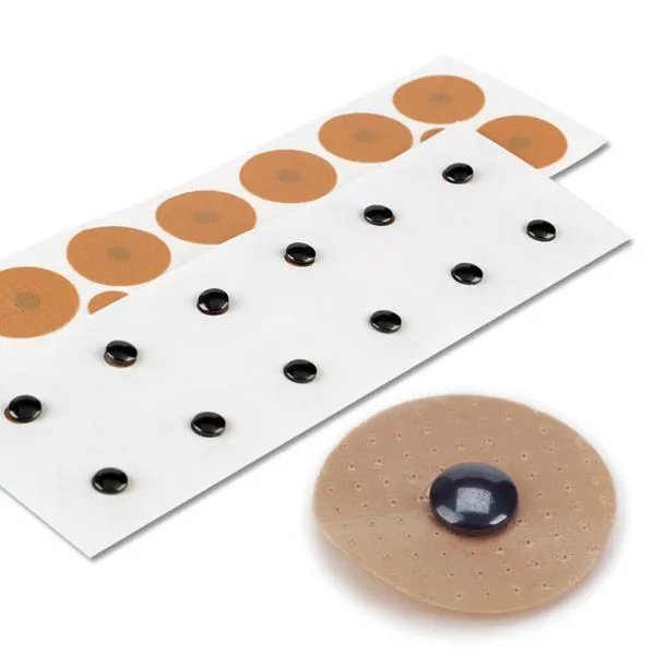 1000 gauss ferrite 0.1" x 0.24" dia magnets with 0.9" dia adhesive plasters. The north and south poles are uniquely aligned along the magnet's edge for a balanced multi-pole effect (no need to turn over). Magnets are smooth and oval in shape; north/south poles are not marked. Pkg of 12.