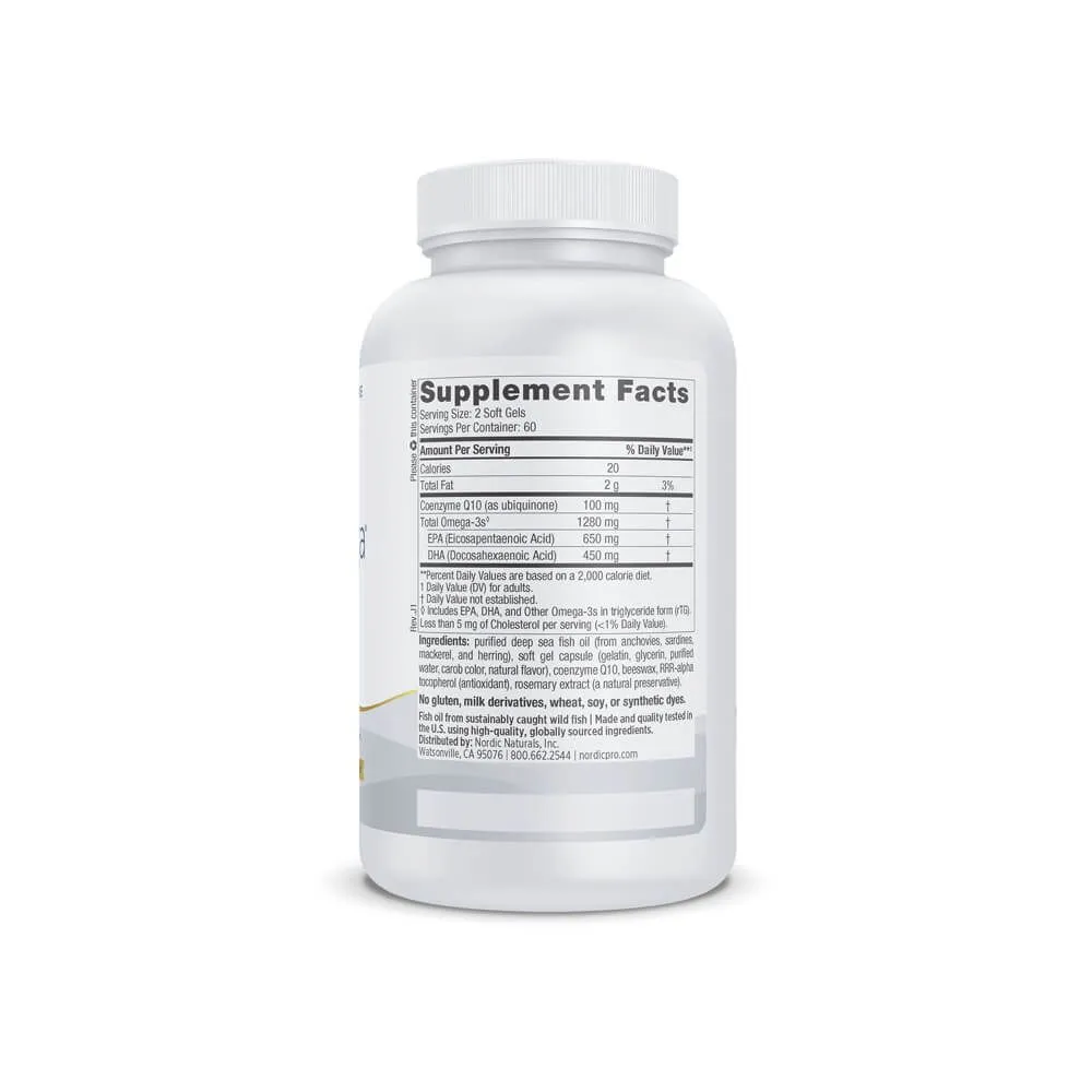 Nordic Naturals Pro Omega CoQ10: High Concentration EPA/DHA Combination with CoQ10. Pro Omega CoQ10 contains a blend of highly concentrated Omega-3 fatty acids and CoQ10 to support cardiovascular health. This fish oil blend is formulated to offer the proven cardiovascular benefits of EPA and DHA from fish oil in combination with the antioxidant and energy-producing actions of CoQ10. Two 1000mg Soft Gels contain: EPA: 650mg, DHA: 450mg, Other Omega-3s: 180mg, Coenzyme Q10: 60mg, Vitamin E: 30 IU.