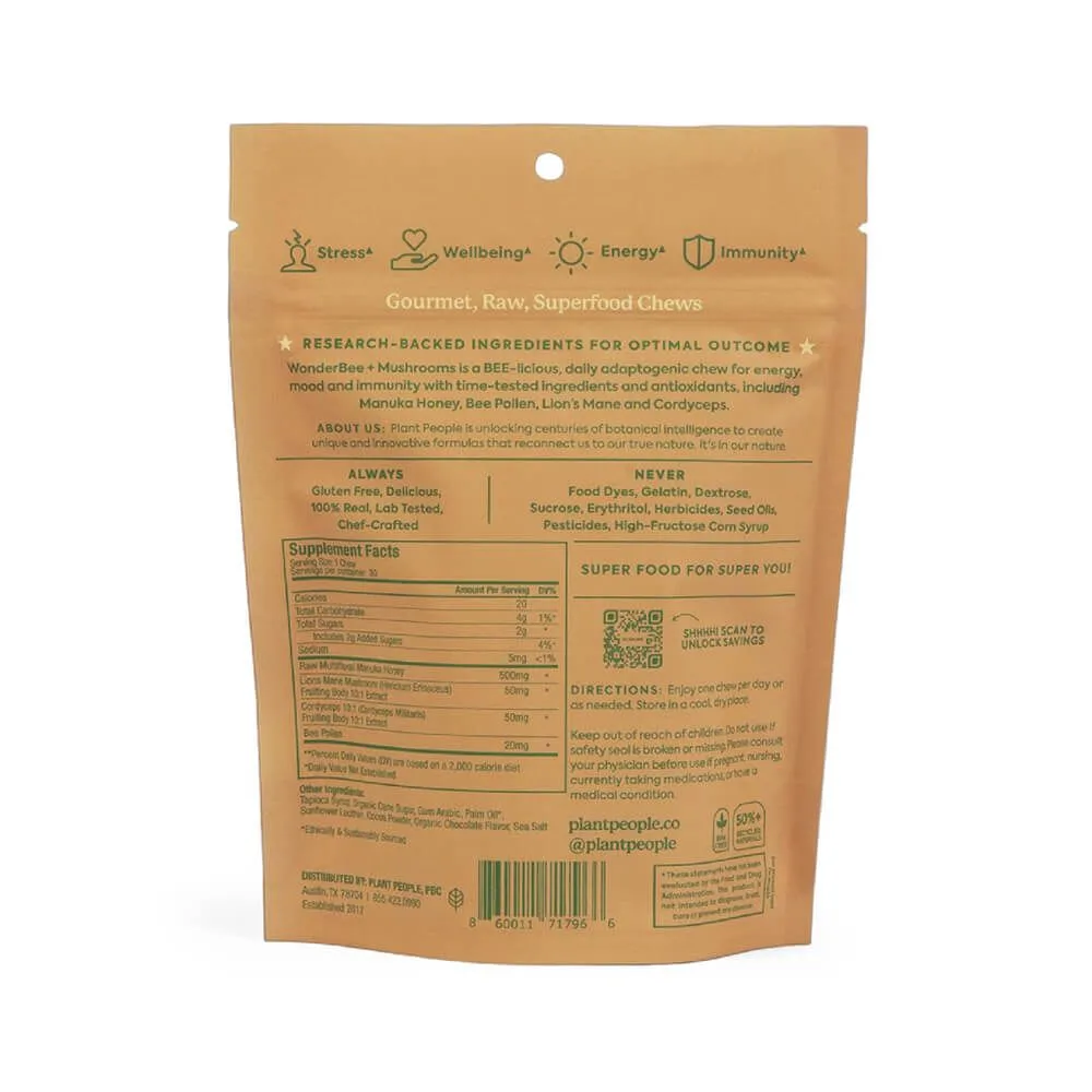 Be super one bite at a time with Plant People WonderBee + Superfood Mushroom Honey Chews. These chews are formulated to enhance cognitive health and mental clarity, reduce stress, improve immune system function, increase stamina, boost natural energy, and provide antioxidant protection from free radicals. They contain an effective blend of clinically-studied, ethically and sustainably sourced ingredients and are chef-crafted, featuring a delightful organic chocolate flavor, perfectly mixing raw Manuka honey and chocolate with a hint of earthy adaptogenic mushrooms. They are lab-tested for herbicides and pesticides, are vegetarian, gluten-free, and contain no corn syrup, dextrose, sucrose, erythritol, seed oils, dyes, or gelatin. Available in resealable, pouches made of recycled materials containing 30 chews.