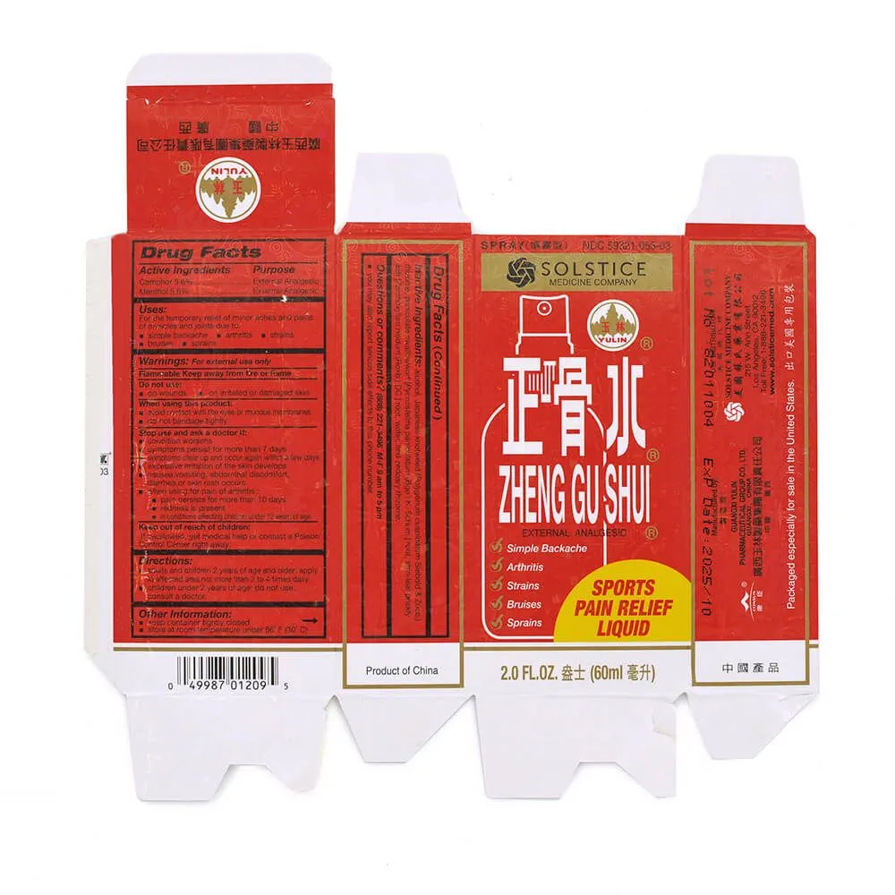 Zheng Gu Shui is an herbal liniment renowned for its powerful and soothing properties. Helping to provide external cooling pain relief with active ingredients camphor and menthol, Zheng Gu Shui may be used for the temporary relief of aches and pains of muscles and joints associated with backache, lumbago, strains, bruises, sprains, and arthritic or rheumatic pain, pain of tendons and ligaments. May be used 3 to 4 times daily but should not be used on irritated or damaged skin. For external use only. Available in a 1 fl. oz liquid, 2 fl. oz. spray, 3.4 oz liquid or 3 fl. oz with direct applicator tip.